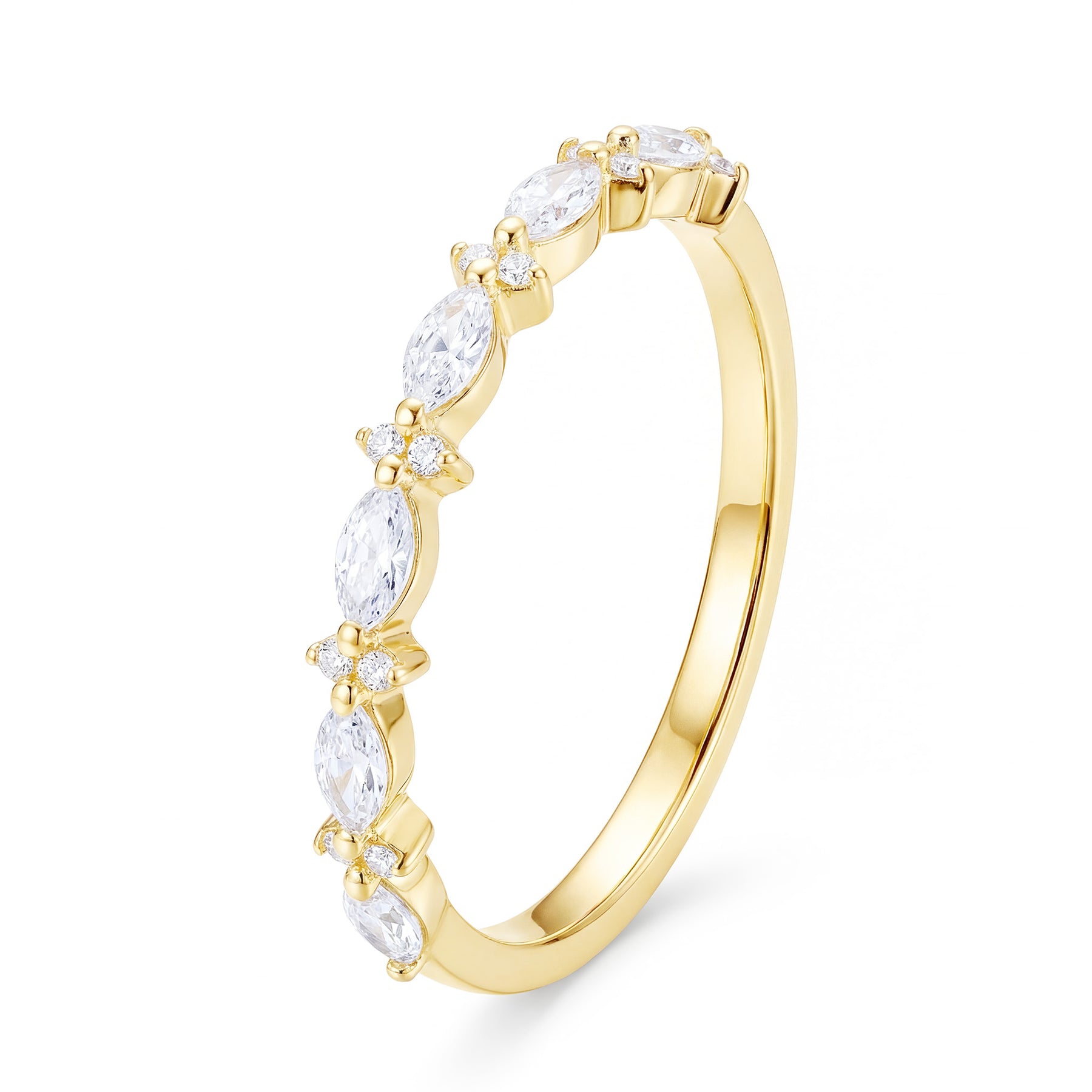 Verleihe Deiner Hand zeitlose Eleganz mit unserem "Elegante" Ring. Der Ring besticht durch kunstvoll abwechselnd platzierte weiße Zirkonia-Steine: sechs Marquise-Schliff (4x2 mm) und zehn runde Steine (1.0 mm). Dieses funkelnde Design fängt das Licht perfekt ein und sorgt für einen glamourösen Auftritt.
